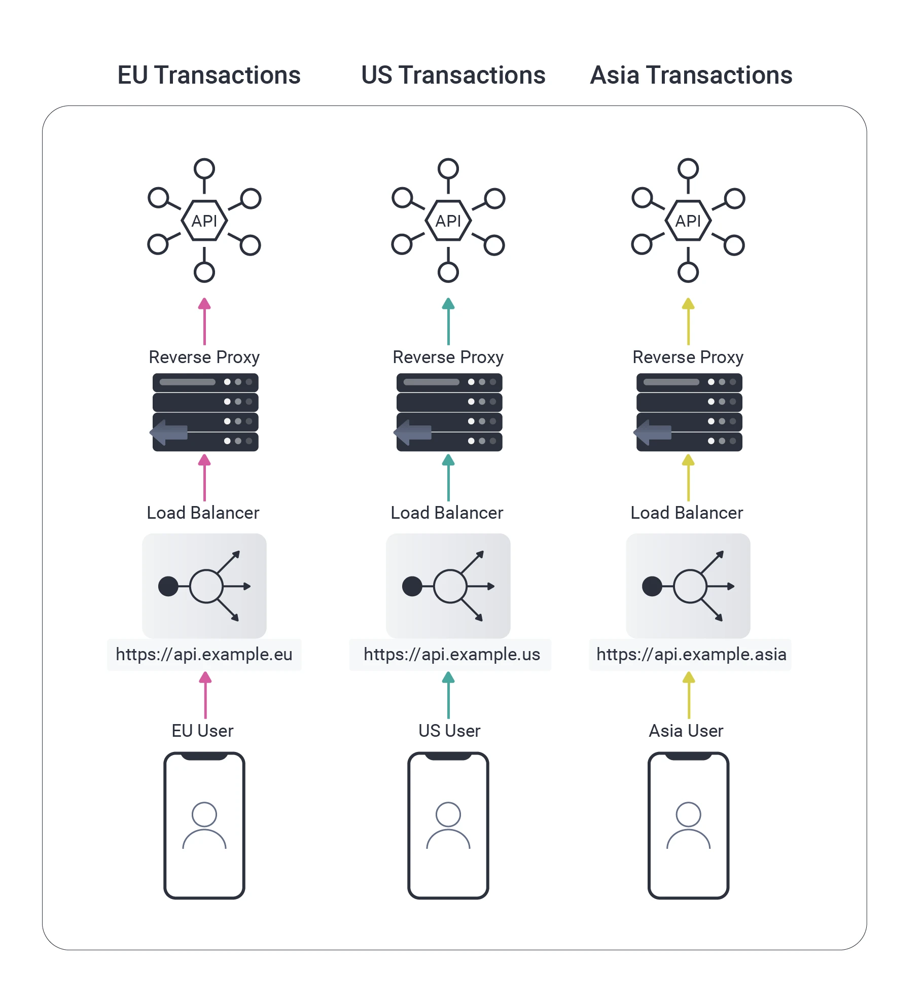 In the past, I would probably have designed a solution via separate URLs, with data stored regionally, as required by Data Sovereignty regulations in some countries. This includes placing a reverse proxy in front of API servers as a security best practice: