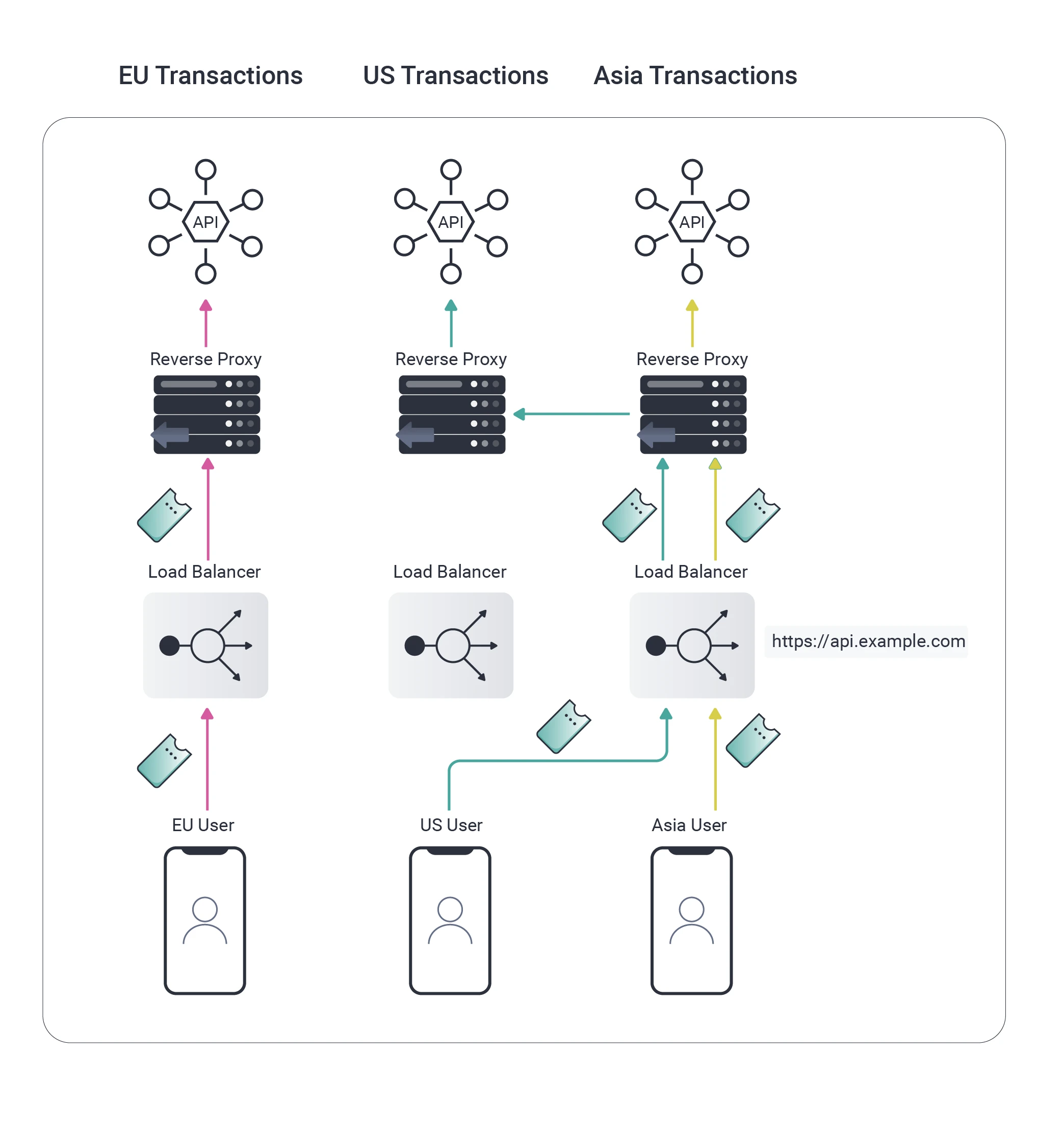 The reverse proxy can continue to use region-specific internal URLs. We can then take closer control of the routing of API requests by making better use of the features of the reverse proxy: